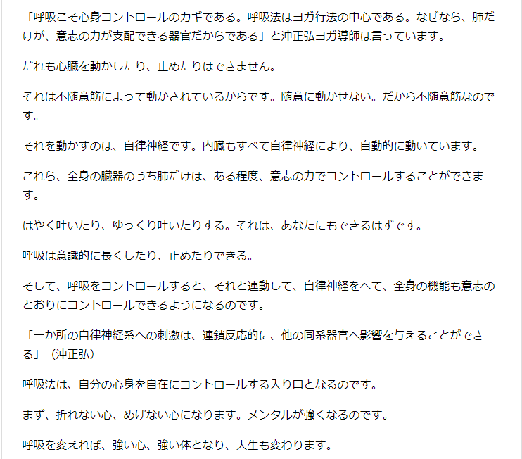 冒頭に述べた沖正弘導師のことば「呼吸が心身コントロールの鍵である」に注目すべきと思います。